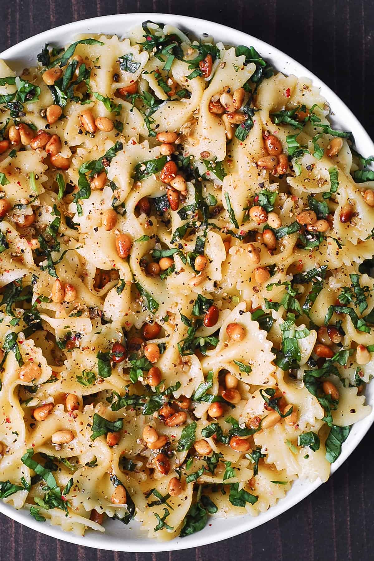 • When ready to serve, top with the remaining half of fresh chopped basil, toasted pine nuts, and cracked black pepper.
